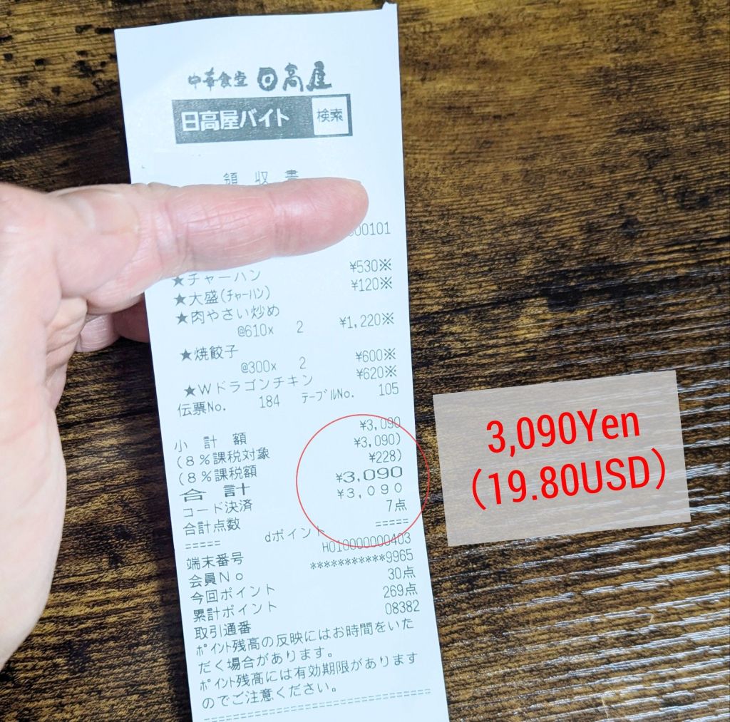 The total amount we paid for our takeout dinner was 3,090 yen. This includes an 8% consumption tax on the food items. Since tipping is not expected in Japan, this cost does not include a tip.