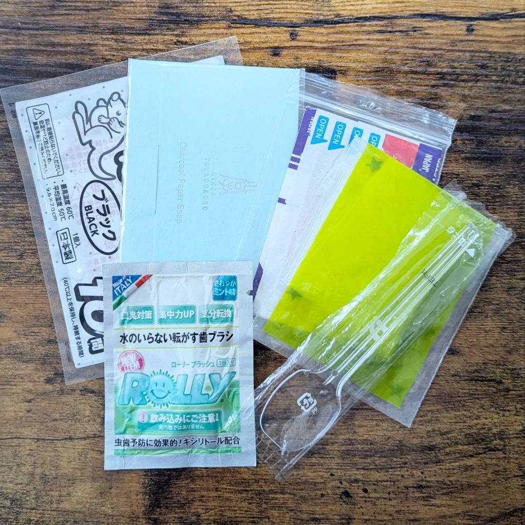 Disposable hand warmers, paper soap, band-aids, disposable toothbrushes, and spoons.