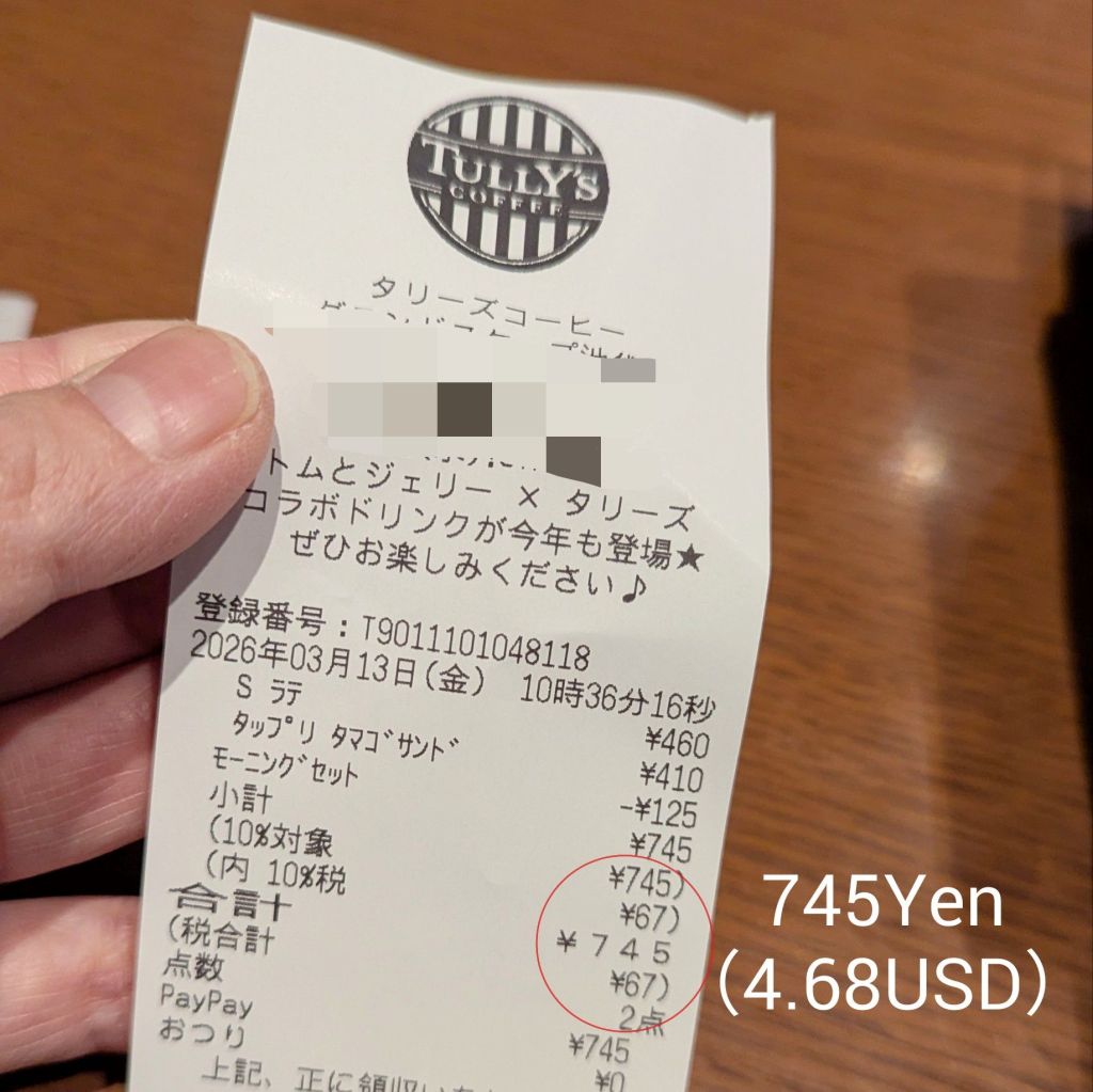 I’ll also share the price. The egg sandwich and café latte came to a total of 745 yen(4.68USD). Fortunately, the “Breakfast Set” discount applied, saving me 125 yen(0.79USD).